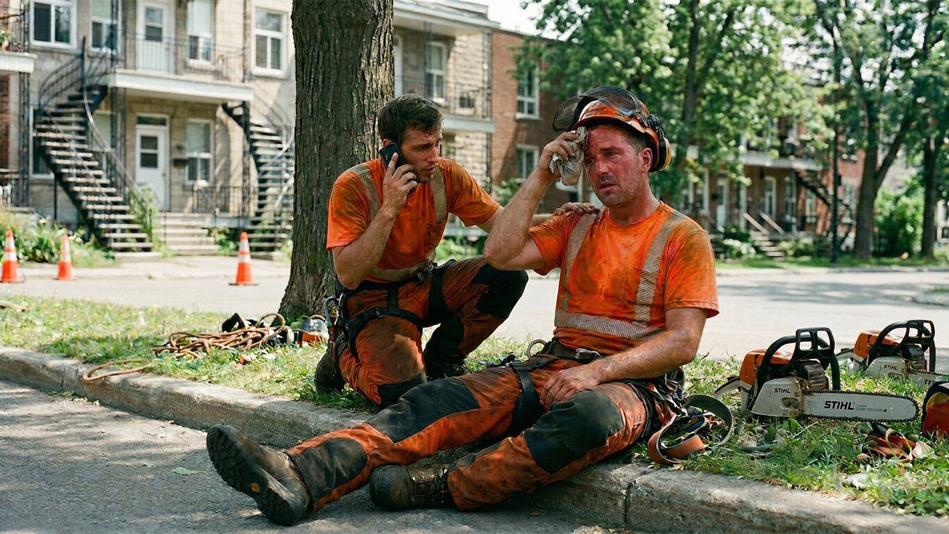 Alors que la plupart des gens peuvent se réfugier à l’intérieur pendant l’humidité intense de l’été montréalais, notre métier exige que nous travaillions directement au soleil, en effectuant un travail physique extrême. Ajoutez à cela l’EPI obligatoire (casques, pantalons de sécurité, bottes) et la concentration intense requise pour travailler en hauteur, et il est facile de comprendre pourquoi les arboriculteurs courent un risque élevé d’être sévèrement atteints par la chaleur.